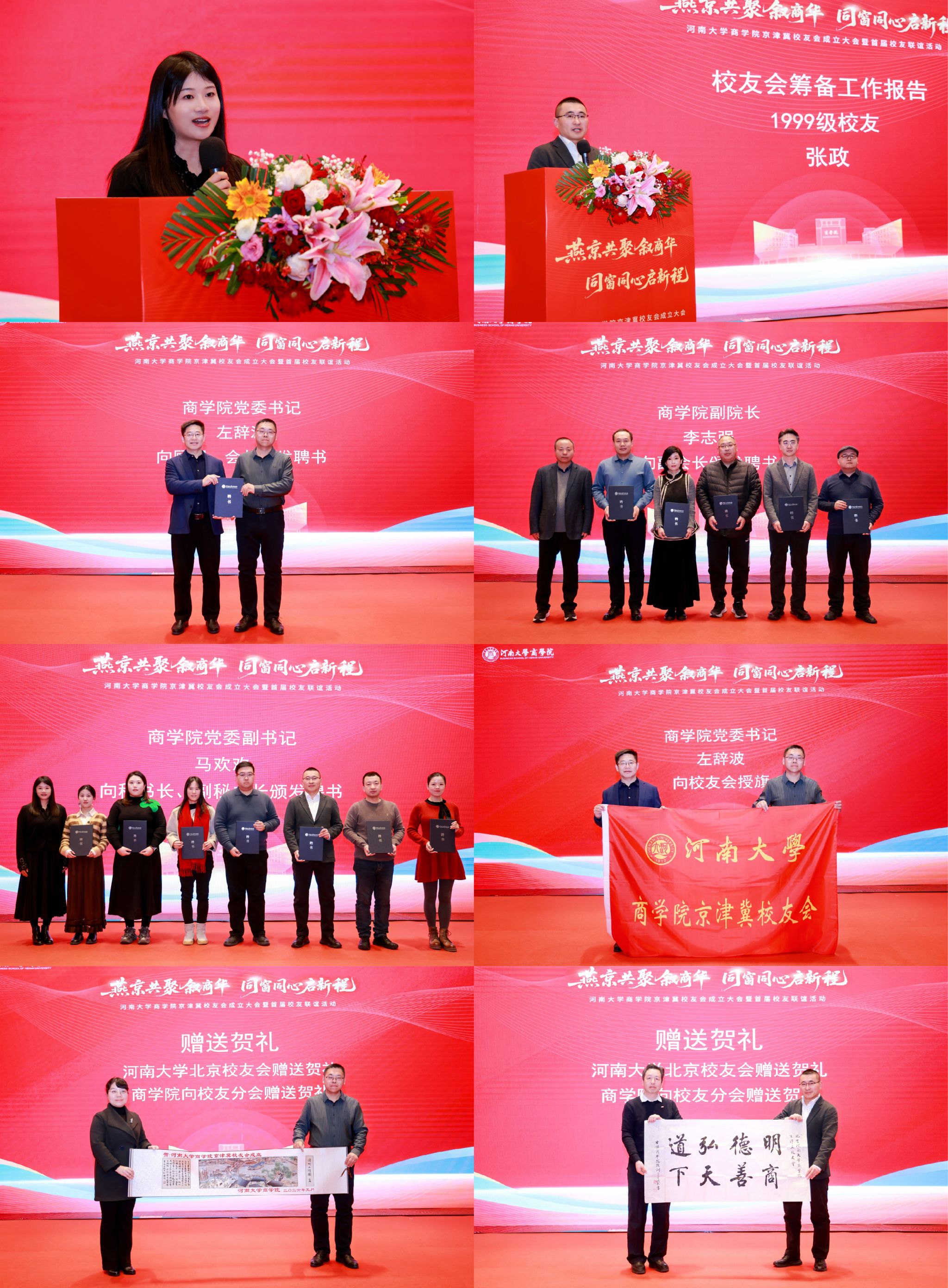 会上,河南大学北京校友会副会长石峰、河南大学mba校友会会长李俊涛、河南大学郑州校友会商学院分会副会长李辉、河南大学上海校友会商学院分会会长孙家凤、河南大学浙江校友会商学院分会会长任刚要、河南大学陕西校友会商学院分会会长张京涛、河南大学广州校友会商学院分会会长徐春龙、河南大学深圳校友会商学院分会会长杜江涛、河南大学海南校友会商学院分会会长吴敏亮、河南大学江苏校友会商学院分会筹备会负责人张太海等纷纷现场或视频祝贺。河南大学北京校友会、商学院分别向河南大学商学院京津冀校友会赠送了贺礼,校友们表演了精彩的文艺节目。