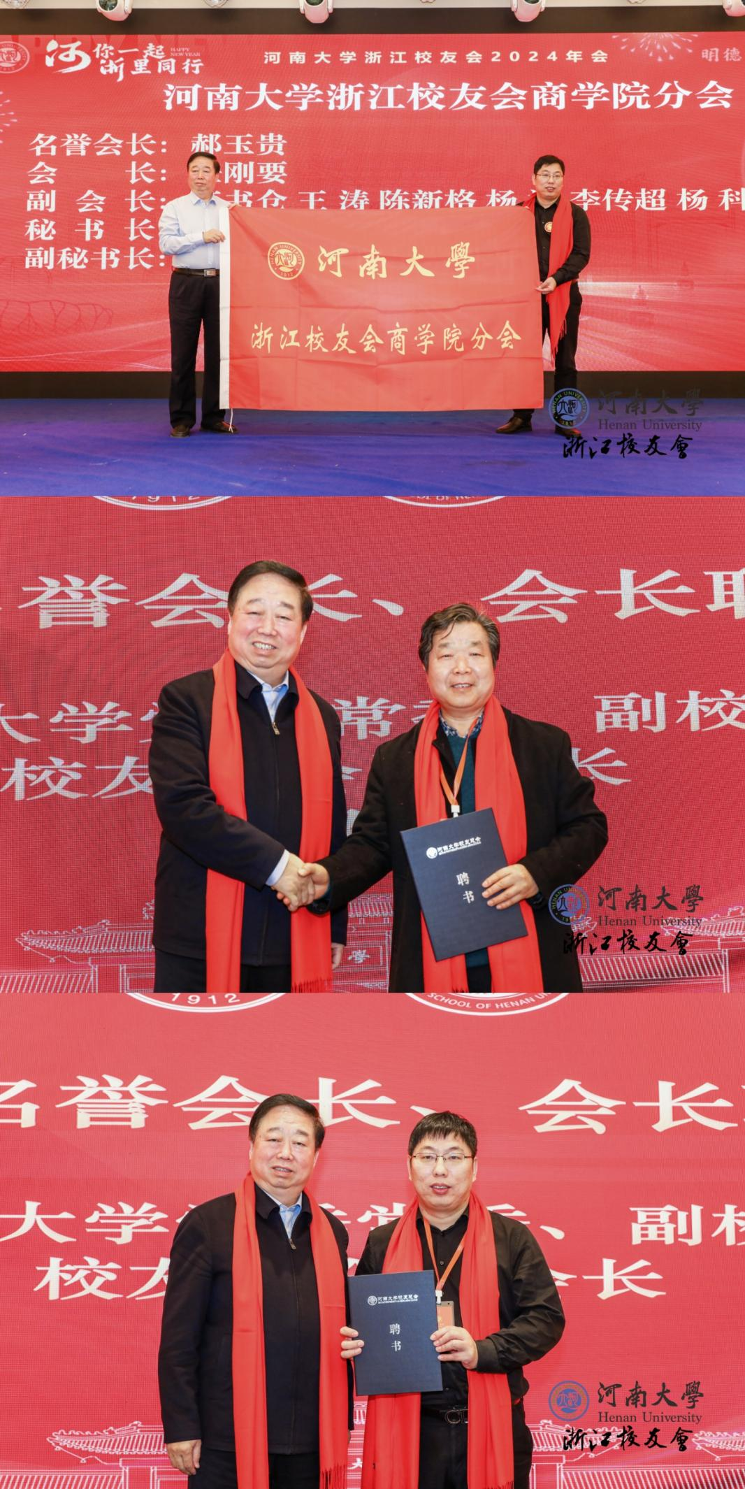 商学院校友工作办公室负责人韩焕法作《筹备工作报告》。经表决,大会通过了《河南大学浙江校友会商学院分会章程》与河南大学浙江校友会商学院分会理事名单。刘会军宣布河南大学浙江校友会商学院分会正式成立,并宣读了名誉会长、会长、副会长、秘书长、副秘书长名单,许绍康向名誉会长、会长颁发聘书并向会长任刚要授旗,刘会军、左辞波分别向副会长、秘书长、副秘书长颁发聘书。河南大学校友总会、商学院分别向河南大学浙江校友会商学院分会赠送了贺礼。
